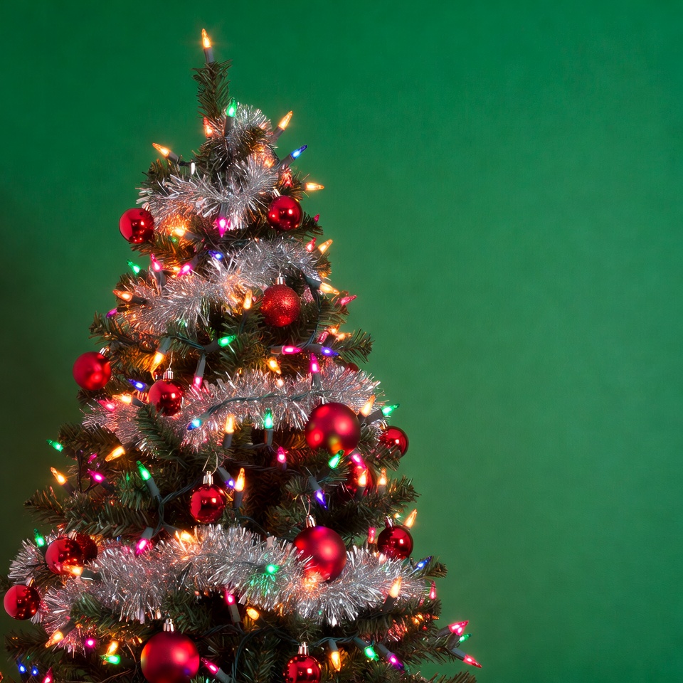 Christmas decor, Christmas lights, Christmas ornament, decorated tree, evergreen tree, festive tree, glowing lights, green background, green garland, holiday decoration, holiday lights, holiday tree, isolated background, lit Christmas tree, multicolored lights, ornament balls, red ornaments, shiny tinsel, silver tinsel, tinsel garland, tree lights, vibrant lights, Christmas tree