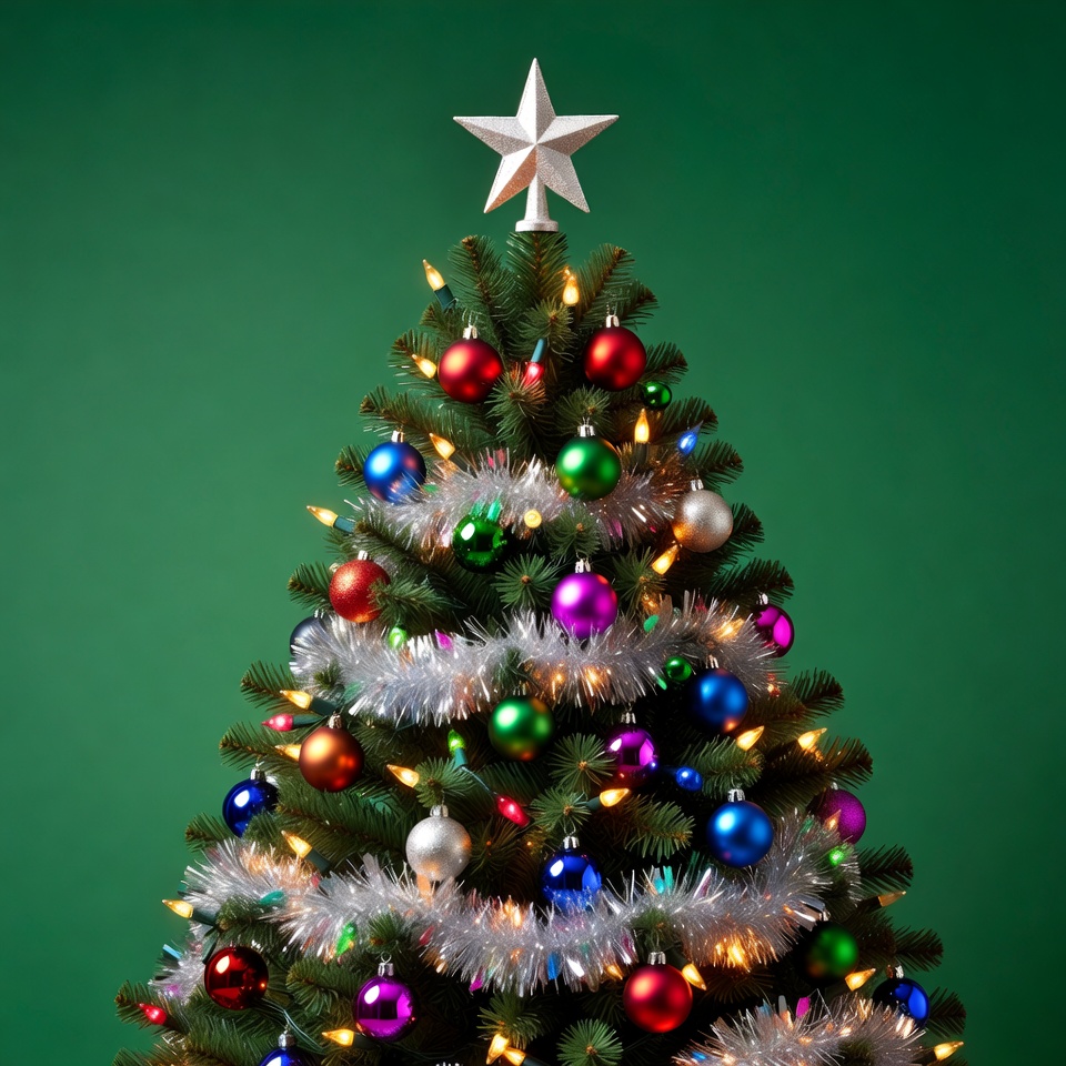 A fully decorated Christmas tree stands on a green background with colorful ornaments in red, blue, green, silver, and gold. White twinkling lights and silver tinsel wrap around the branches. A large white star sits atop the tree.