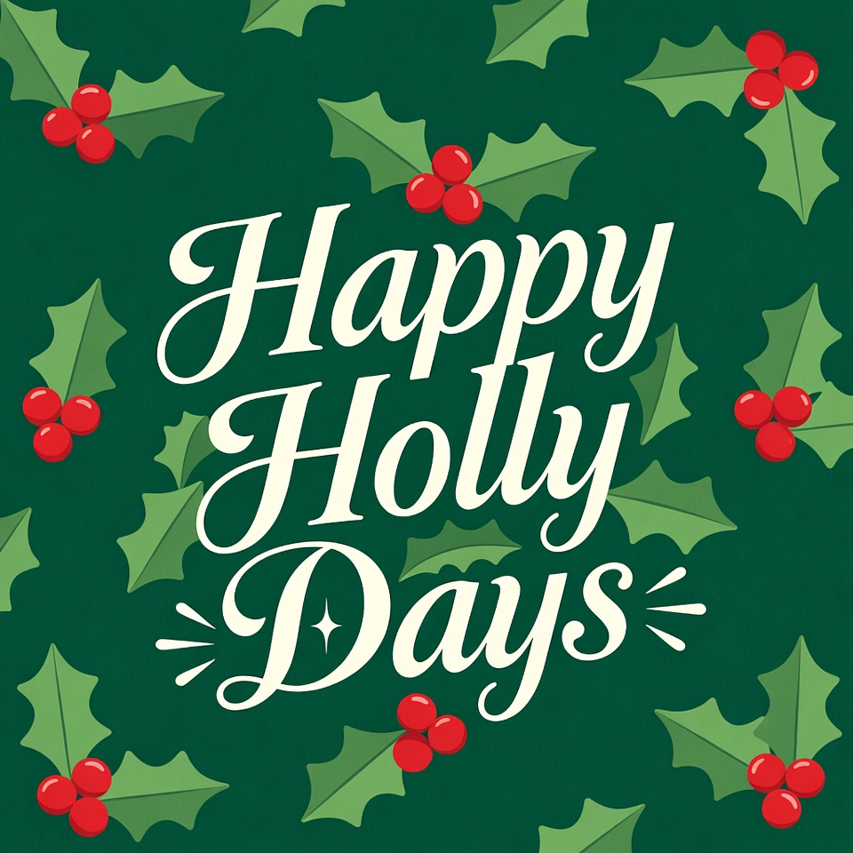 A festive illustration features 'Happy Holly Days' text in elegant white script on a dark green background. Bright red holly berries and green holly leaves with spiky edges surround the text. The design is clipart-style with no people or other elements.