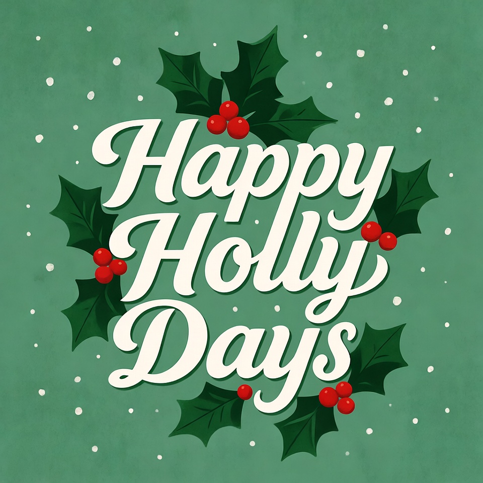 A festive illustration features 'Happy Holidays' text in elegant white script on a green background. Surrounding holly leaves with red berries and scattered snowflakes add a Christmas theme. The design is vibrant and celebratory.