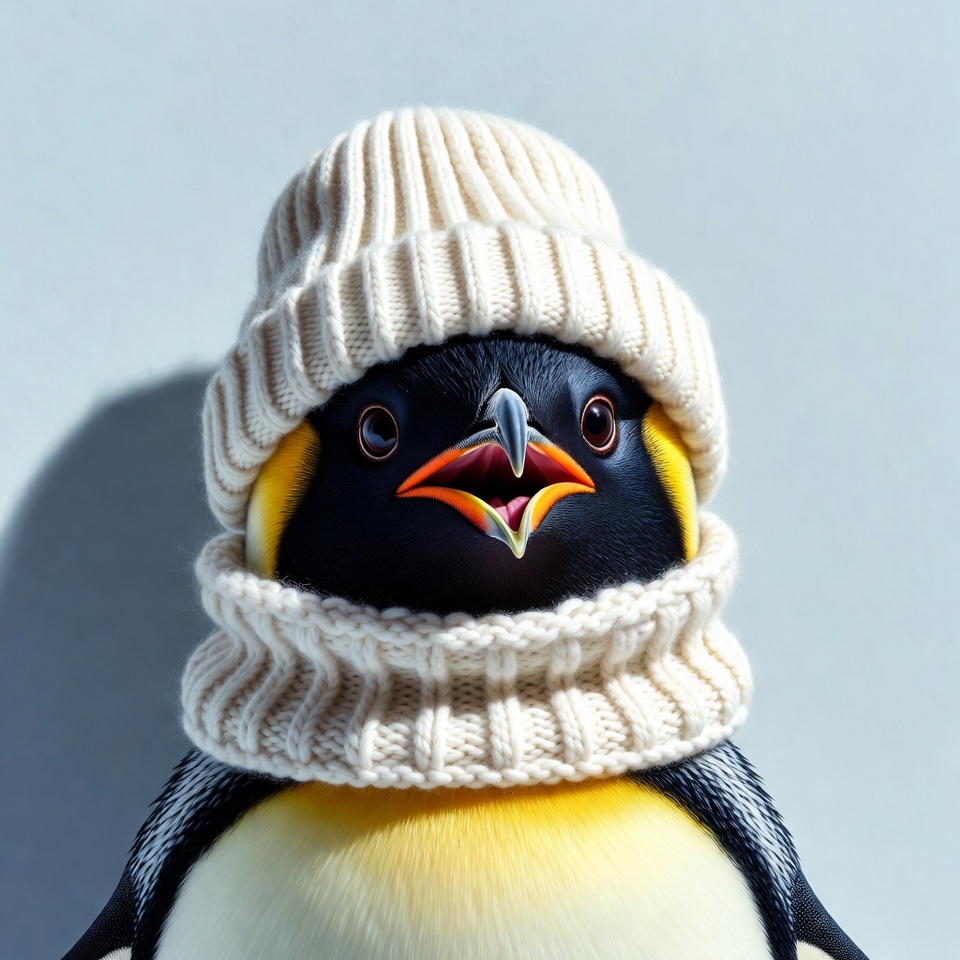 animal, beanie, bird, black feathers, cozy penguin, cute animal, emperor penguin, funny animal, isolated background, knit hat, orange beak, scarf, white hat, white knitwear, winter clothing, yellow feathers, penguin