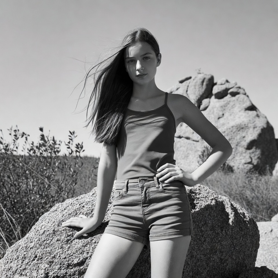White, black and white, boulders, bushes, camisole top, confident pose, denim shorts, desert, female, flowing hair, hands on hips, long hair, monochrome, outdoor, portrait, posing, rocks, short shorts, tank top, windblown hair, young woman, teen girl