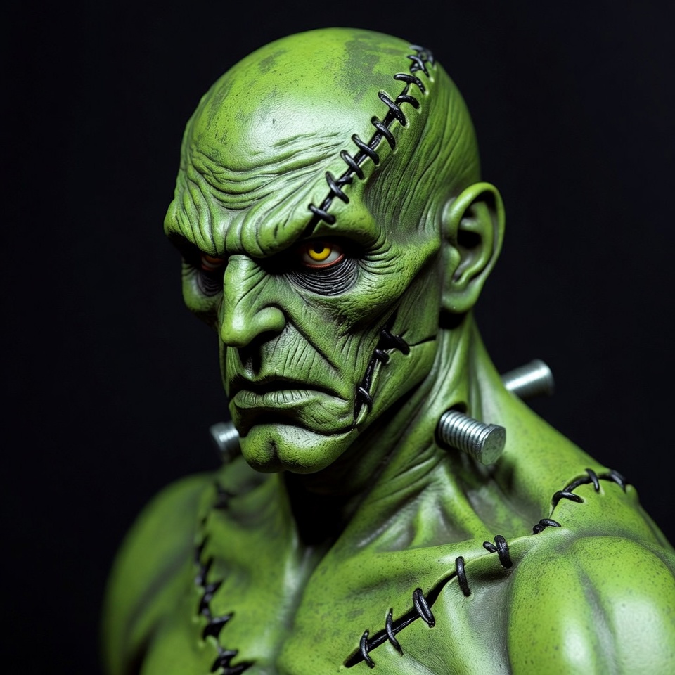 A detailed closeup of a Frankenstein monster with green skin, prominent stitches across its bald head and face, and yellow glowing eyes. Metal bolts protrude from its neck, and it has a menacing scowl on a black background. The figure is muscular and rendered in a realistic sculpt style.