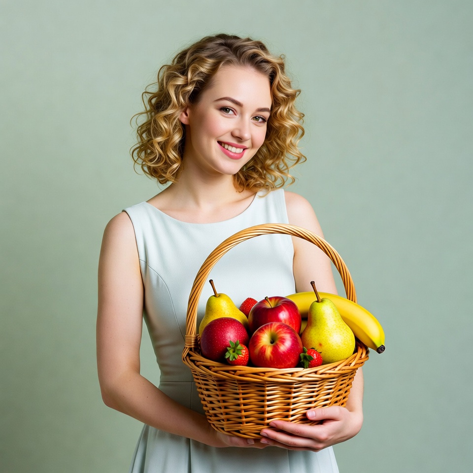 A young woman with curly blonde hair smiles while holding a woven basket filled with fresh fruits including red apples, yellow pears, bananas, and strawberries. She wears a sleeveless light blue dress and stands against a light green background. The fruits are vibrant and overflowing from the basket.