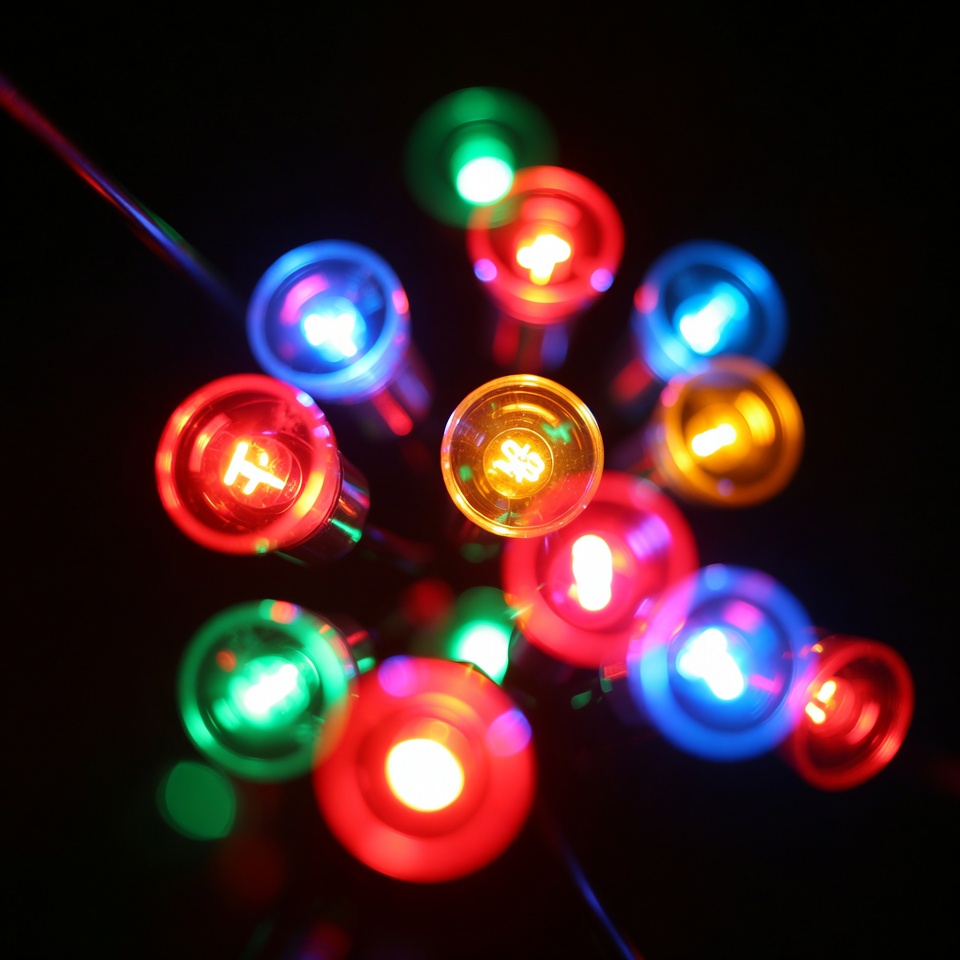 LED lights, blue lights, bokeh effect, celebration, close-up, colorful lights, dark background, decoration, festive lights, glowing bulbs, green lights, holiday lights, illuminated, lens flare, multicolored, party lights, red lights, string lights, twinkling lights, vibrant colors, yellow lights, Christmas lights