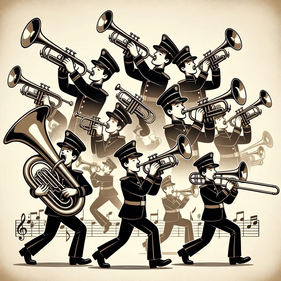 A vintage-style black and white illustration depicts numerous uniformed men in peaked caps playing brass instruments like trumpets and tubas. They are arranged in a dynamic marching formation with musical notes floating around them. The figures are rendered in a retro line art style on a textured background.