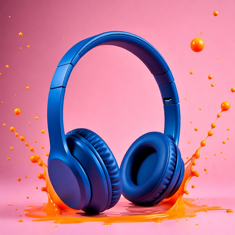 3D render, audio equipment, blue headphones, glossy headphones, isolated background, music headphones, orange droplets, orange splashes, over-ear headphones, paint splatter, pink background, product render, vibrant colors, wireless headphones, headphones