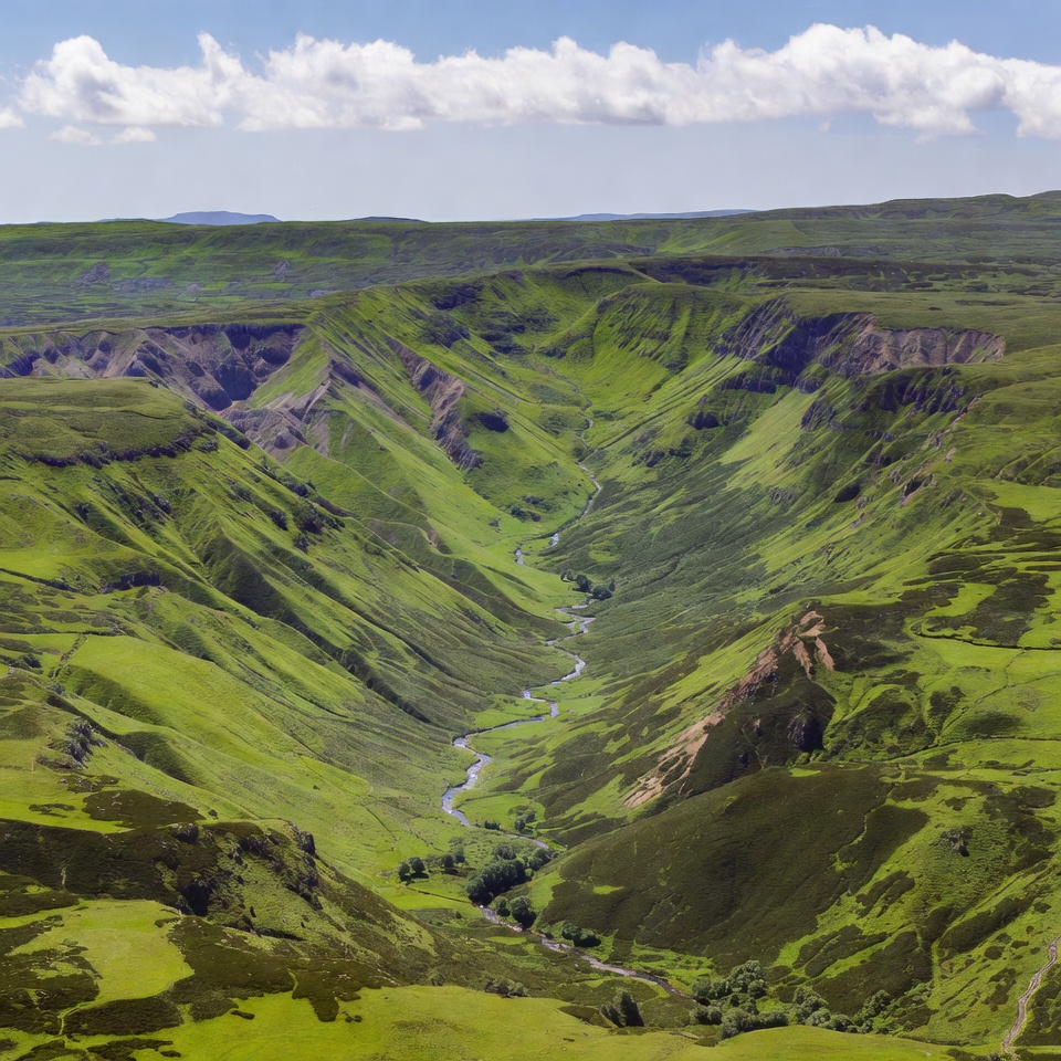 Aerial view of lush green valley with steep grassy hills and rugged cliffs. A winding river flows through the center of the verdant landscape. Scattered clouds dot the bright blue sky above the expansive terrain.
