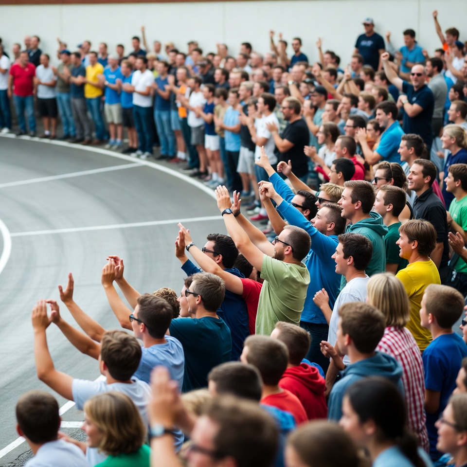 asphalt track, audience, casual clothes, cheering, clapping, colorful shirts, diverse group, energetic, enthusiastic, excited fans, group celebration, large crowd, men, mixed genders, motorsport, outdoor event, people, racetrack, racing fans, raised hands, spectators, sports event, standing, summer outfits, sunny day, trackside, white wall, women, crowd