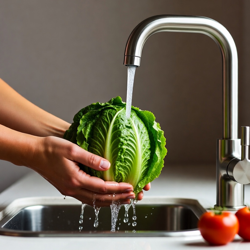 A woman's hands hold a large green cabbage under a running stainless steel faucet in a kitchen sink. Water streams over the cabbage, rinsing it clean. A few red tomatoes sit nearby on the counter.