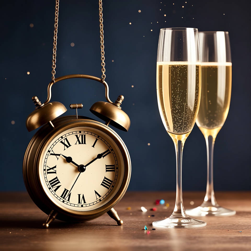 12 o'clock, Roman numerals, bubbles, celebration, champagne flutes, champagne glasses, clock bells, confetti, countdown, dark background, festive, festive decor, gold clock, golden champagne, holiday, luxury, midnight, midnight celebration, new year, new years eve, party, sparkles, time, wooden table, alarm clock
