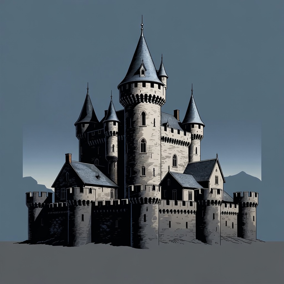 architecture, drawing, fantasy castle, fortress, gothic, ink illustration, isolated background, medieval castle, mountains, ramparts, rocky base, steeple, stone walls, towers, turrets, castle