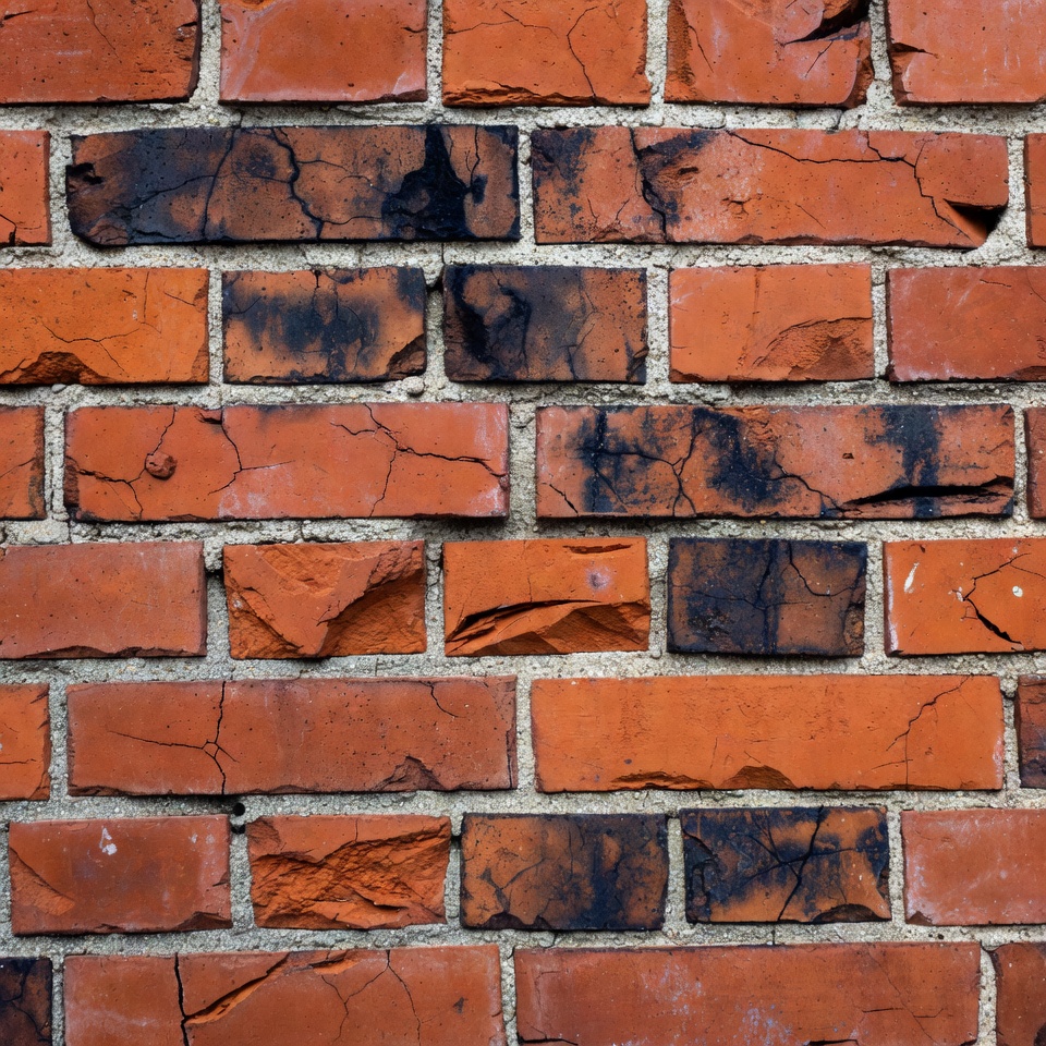 A close-up view of a weathered red brick wall with irregular mortar lines. Dark soot stains and cracks mar the surface of the bricks. The texture shows aged and distressed construction material.