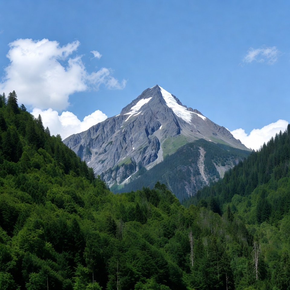 A tall snow-capped mountain peak rises sharply against a clear blue sky with scattered white clouds. Dense green forests cover the surrounding slopes and valleys. The rugged gray rock faces contrast with the white snow on top.