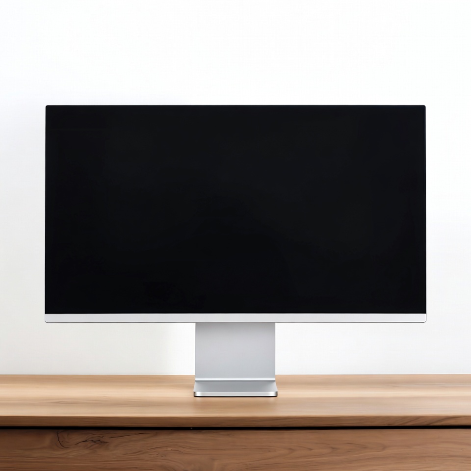 Apple Studio Display, black screen, computer monitor, desk, display, electronics, isolated background, modern monitor, office desk, silver stand, technology, thin bezel, white monitor, wooden desk, monitor