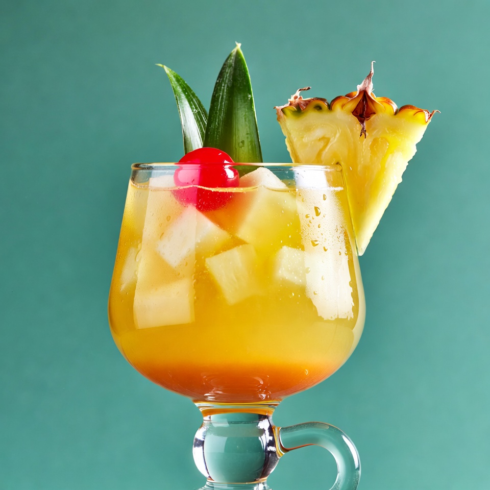 beverage, cocktail, cocktail glass, exotic cocktail, fruity drink, garnished drink, green leaves, isolated background, pineapple, pineapple chunks, pineapple garnish, pineapple wedge, red cherry, refreshment, summer cocktail, tall glass, turquoise background, vacation drink, yellow drink, tropical drink