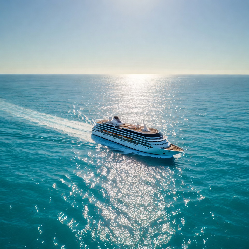 aerial view, balcony, blue sky, calm water, deck, horizon, luxury liner, marine, nautical, ocean, passenger ship, sea, ship wake, sunlight reflection, sunny day, turquoise sea, vacation travel, vessel, white ship, cruise ship