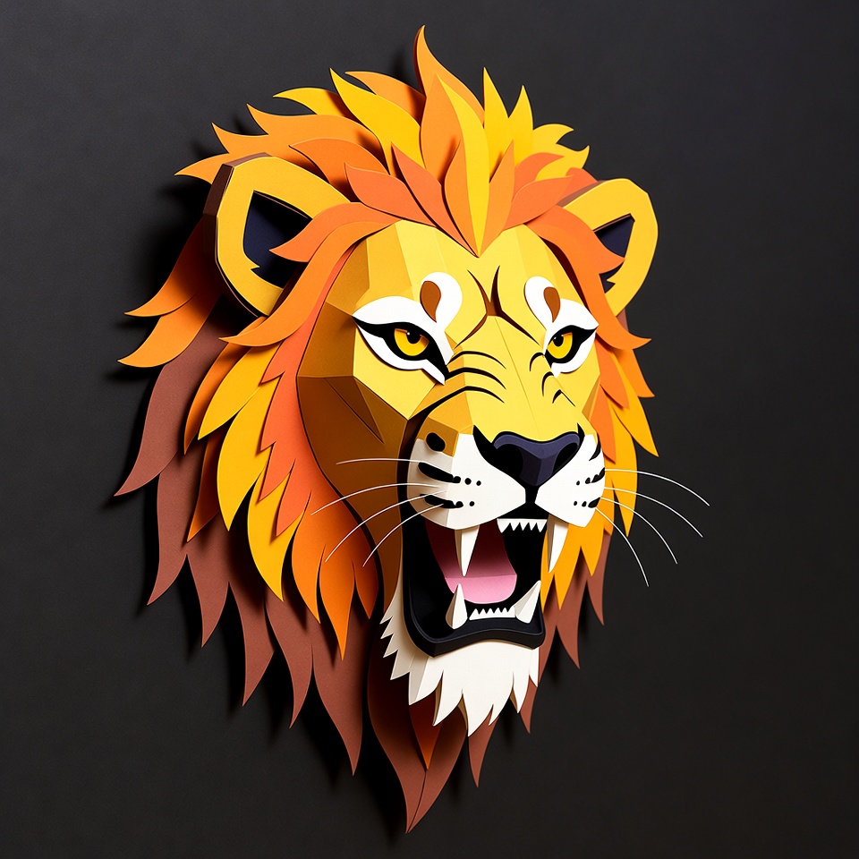 A detailed 3D paper craft lion head with vibrant orange and yellow layers features a fierce roaring expression. The lion has a voluminous mane, yellow eyes, white fangs, and is positioned against a solid black background. The geometric papercraft design emphasizes sharp edges and layered construction.