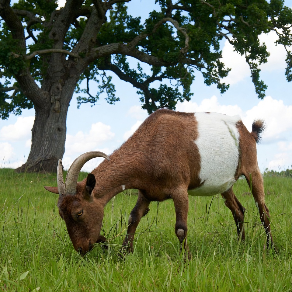 A brown and white goat with curved horns grazes on green grass in a field. A large oak tree stands behind it under a blue sky with scattered clouds. The goat is positioned with its head lowered to the ground.