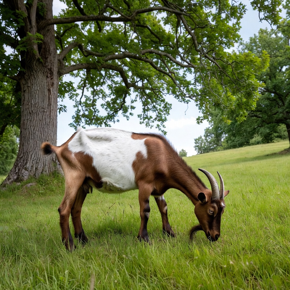 A brown and white goat with curved horns grazes on lush green grass in a meadow. It stands near a large oak tree with a forest backdrop under a blue sky. The goat has a visible udder and is positioned sideways while eating.