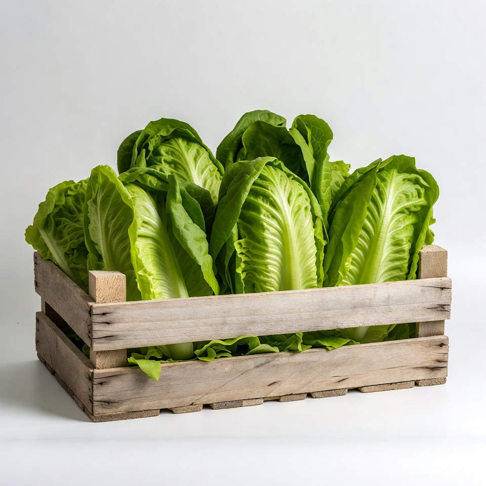 A wooden crate filled with fresh green lettuce heads sits on a white background. The lettuce leaves are vibrant and crisp, overflowing slightly from the crate. The wooden crate has a rustic appearance with visible grain and nails.