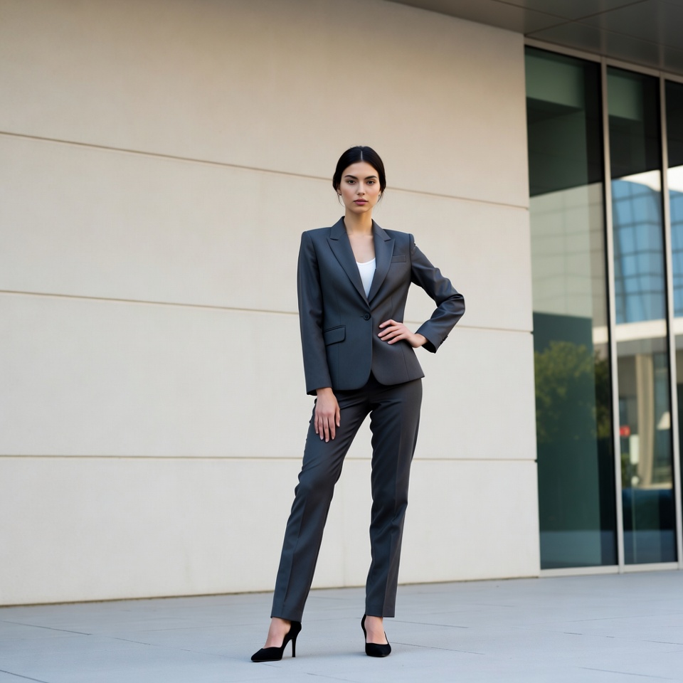 A young Asian woman with long dark hair stands confidently in front of a modern beige building with glass windows. She wears a tailored gray pantsuit with a white blouse and black high heels, posing with one hand on her hip. Her expression is poised and professional.