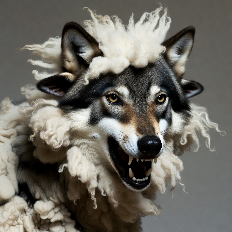 A gray wolf with thick white wool covering its neck and head snarls with bared teeth. Its yellow eyes are intense, and fluffy wool tufts frame its face against a plain gray background. The wolf's fur is a mix of gray, white, and brown tones.