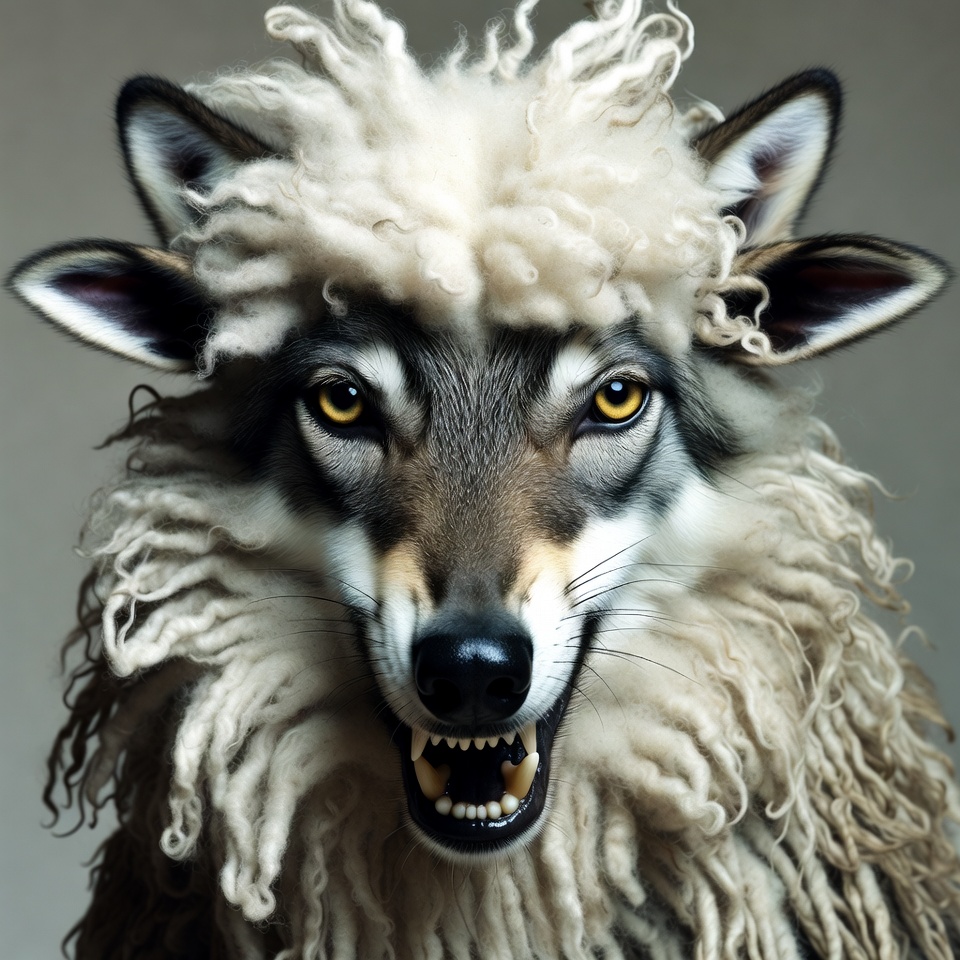 A wolf with thick, curly white sheepdog-like fur covers its head and neck. It has pointed ears, yellow eyes, and a snarling mouth revealing sharp teeth. The animal faces forward against a plain gray background.