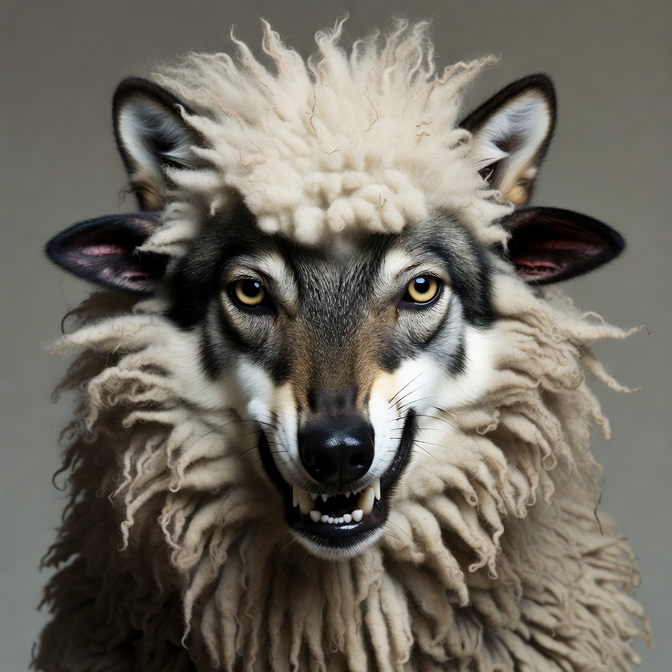 animal costume, black ears, canine, fluffy sheep, funny animal, gray fur, humorous wolf, isolated background, mammal, sharp teeth, sheep costume, sheep disguise, snarling wolf, white wool, wildlife, wolf face, woolly wolf, yellow eyes, wolf