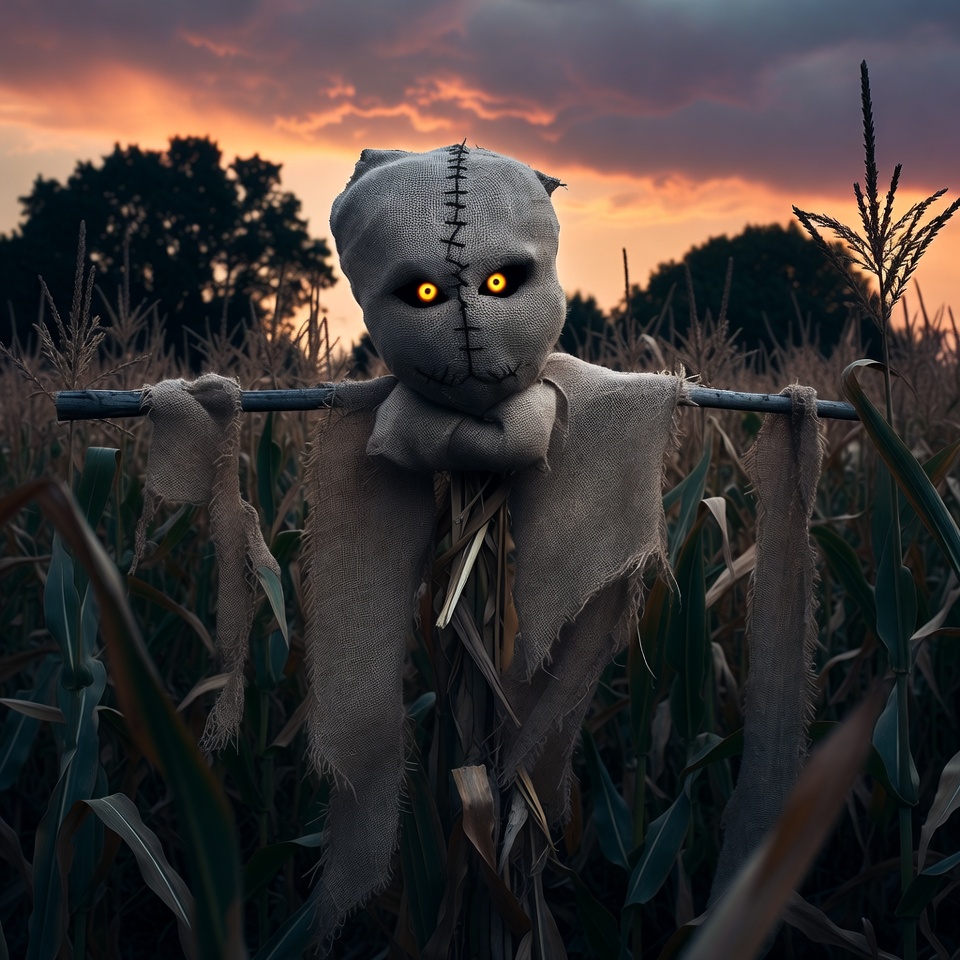 A creepy scarecrow with stitched burlap face and glowing yellow eyes stands on a wooden cross in a tall cornfield. It wears ragged cloth draped over its frame amid green cornstalks. The scene is set against a dramatic sunset sky with dark clouds and silhouetted trees.