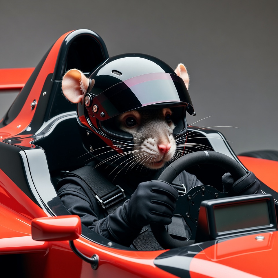 An anthropomorphic rat wearing a black helmet and gloves sits in a red race car cockpit. It grips the steering wheel with focused eyes and whiskers visible. The car features black accents and a dashboard display on an isolated background.