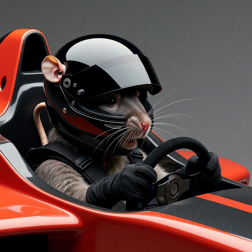 A cute gray rat wearing a black helmet and gloves sits in a bright orange race car cockpit. It grips the steering wheel with determination, with large ears poking out from the helmet and whiskers visible. The car features a sleek carbon fiber design on a plain background.