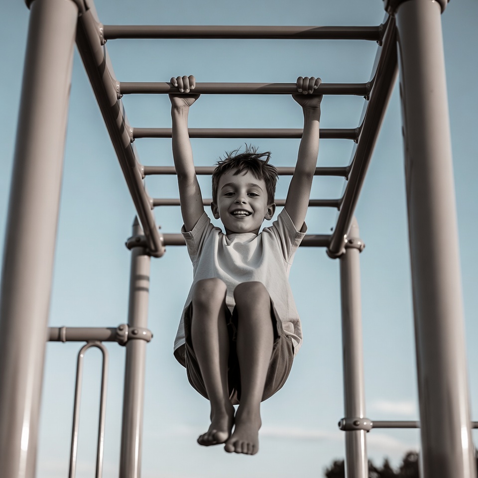 Boy hanging from monkey bars