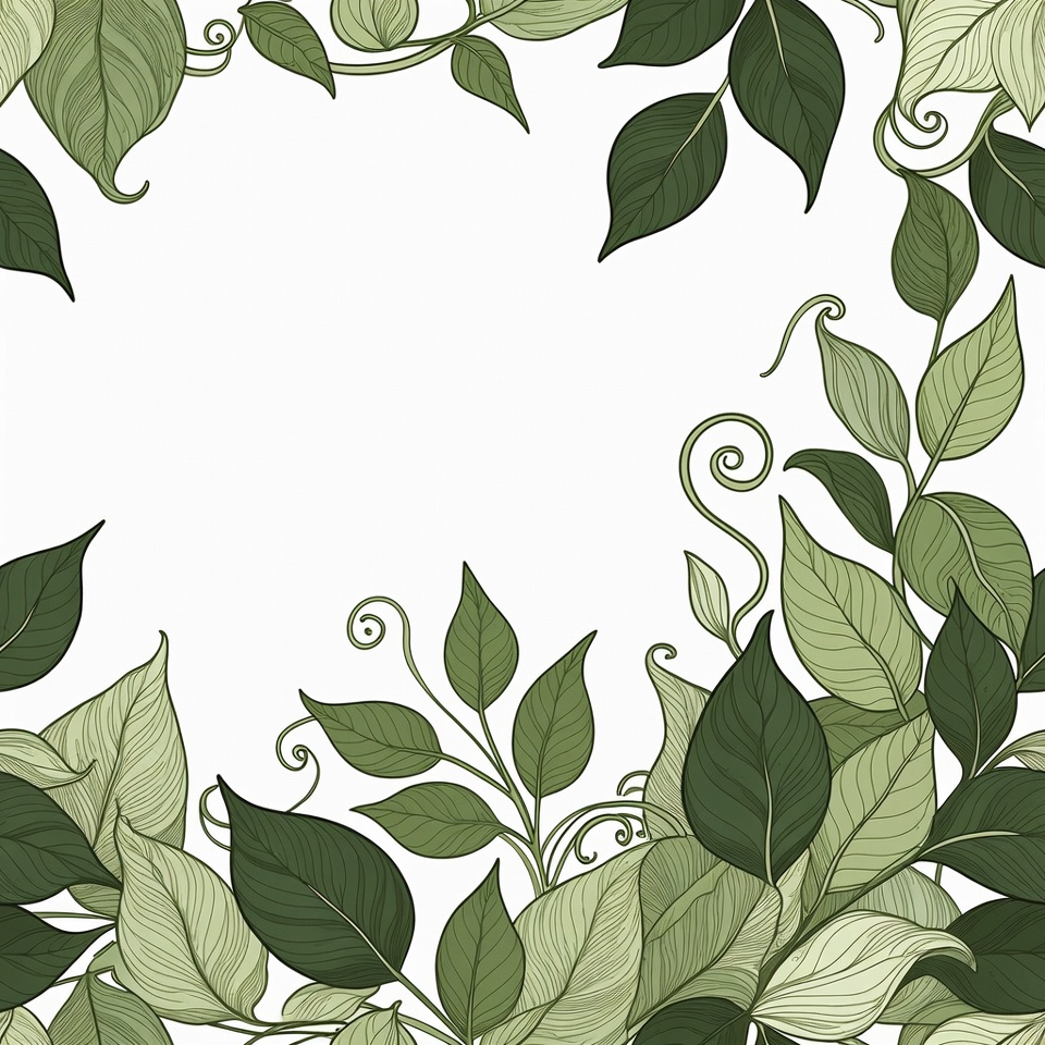 A hand-drawn illustration of green leaves and vines arranged in a decorative frame on a white background. The leaves feature intricate details with varying shades of green and subtle white highlights. Tendrils curl elegantly around the edges, forming an open rectangular border.