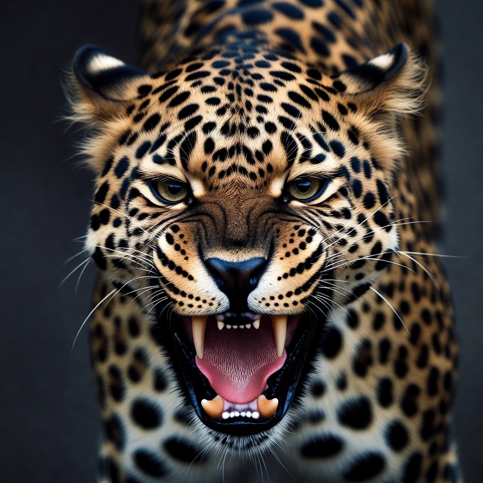 aggressive pose, animal portrait, big cat, black rosettes, dark background, feline, intense stare, leopard fur, open mouth, predator, roaring leopard, sharp fangs, snarling cat, spotted leopard, wild animal, wildlife, yellow eyes, leopard