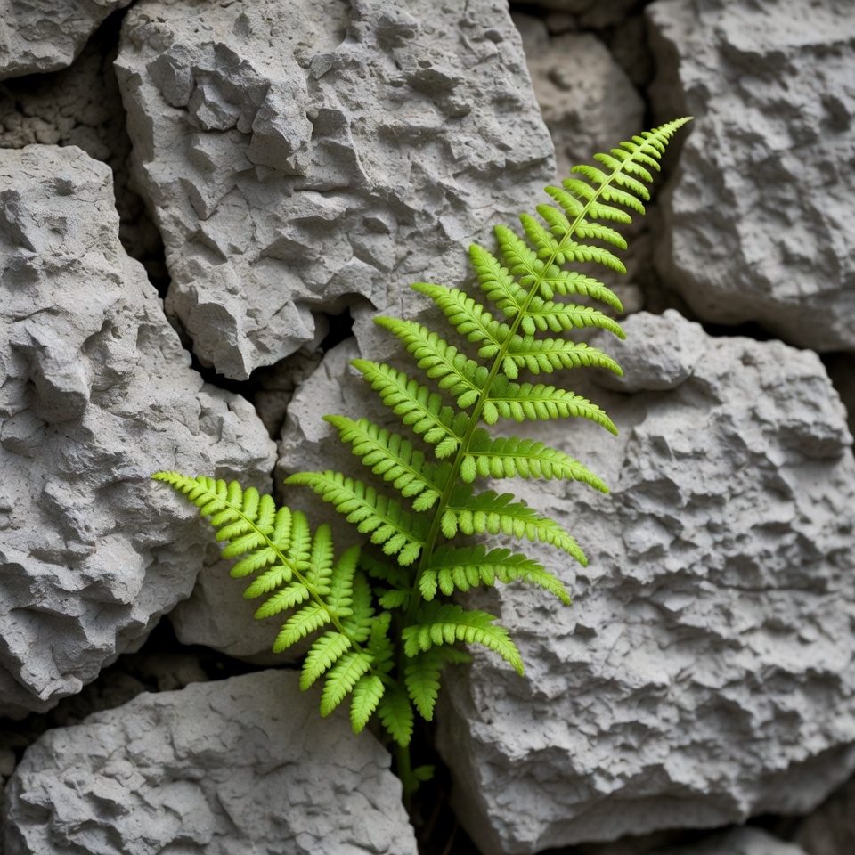 A vibrant green fern plant grows from a crack in a textured gray stone wall. The fern's delicate fronds extend outward against the rough concrete surface. The plant appears fresh and healthy amidst the rugged stones.