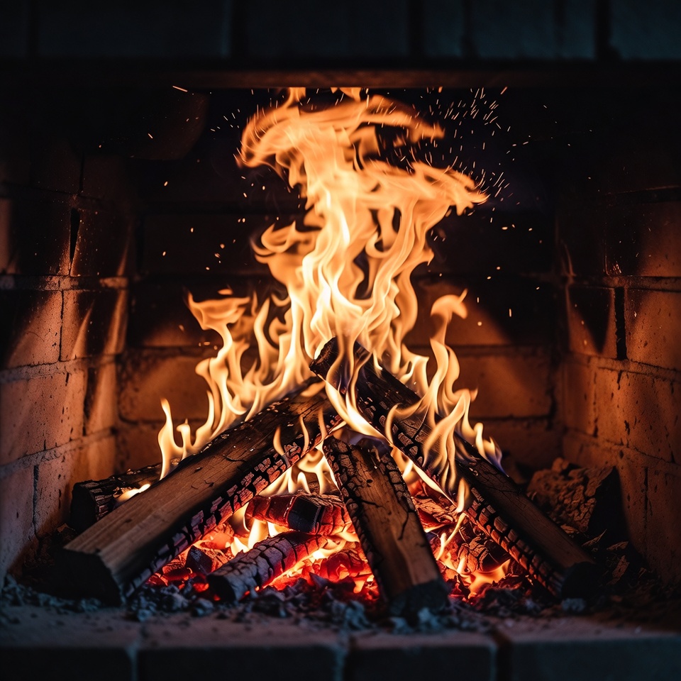 brick fireplace, burning logs, burning wood, campfire logs, cozy fire, dark background, fire, fire glow, fireplace interior, flame sparks, flames, glowing embers, hearth, indoor fire, log fire, orange flames, red fire, sparks, wood fire, fireplace