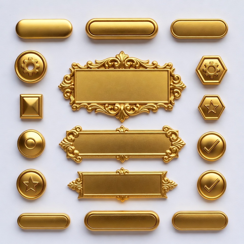 A collection of 3D gold buttons, badges, and ornate frames arranged on a white background. Designs include simple oval and circular buttons, geometric shapes like squares, hexagons, and stars, as well as intricately decorated rectangular frames with floral motifs. Various elements feature checkmarks, gears, and plain surfaces for versatile use.