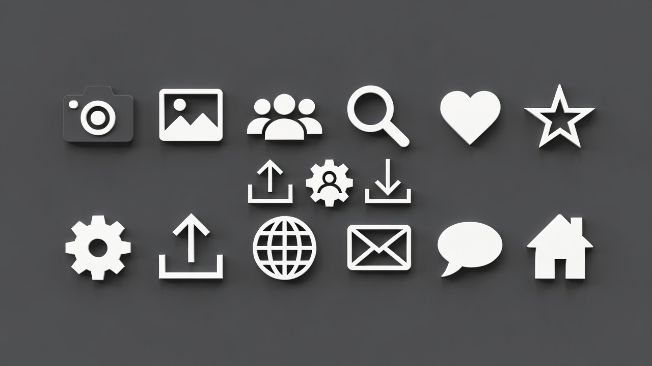 3D icons, app icons, camera icon, chat bubble, dark background, download arrow, email icon, gear icon, globe icon, heart icon, house icon, illustration, people group, photo icon, search icon, star icon, ui icons, upload arrow, vector icons, web icons, white icons, social media icons