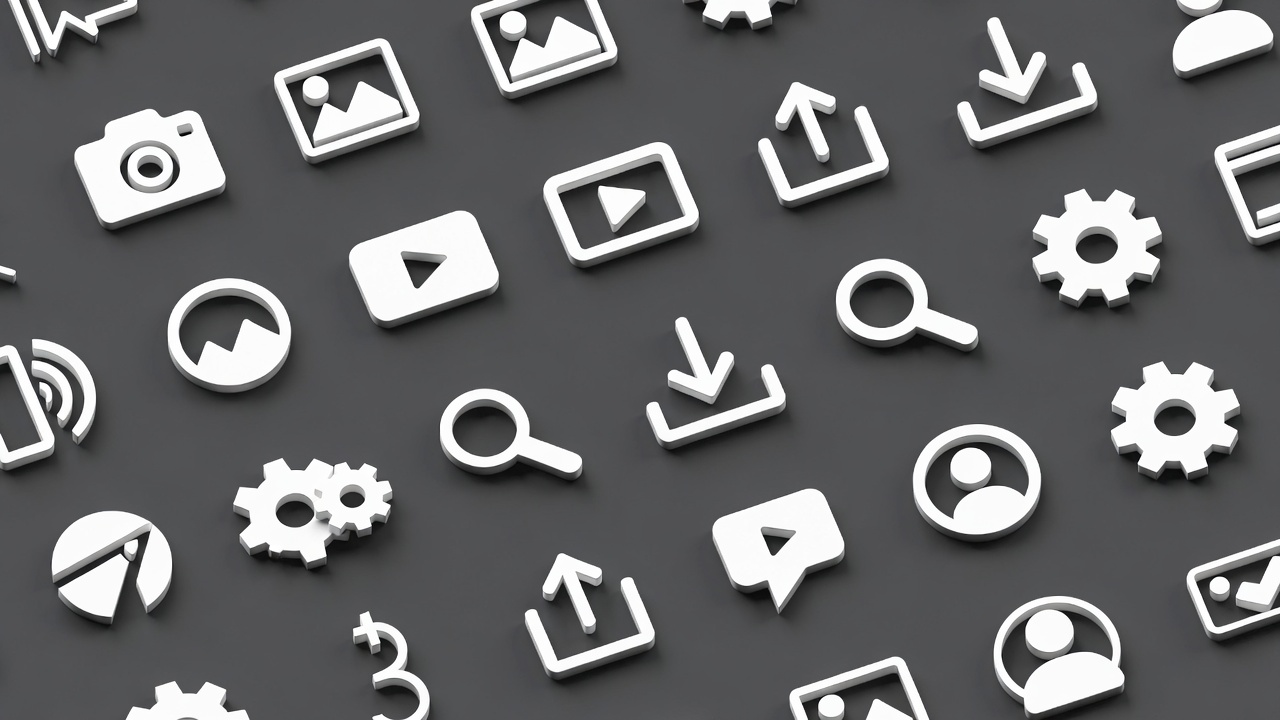 A collection of white 3D icons depicting media and technology symbols scattered across a dark gray background. Icons include cameras, photos, videos, gears, search magnifying glasses, upload and download arrows, and user profiles. The icons are rendered in a realistic 3D style with shadows for depth.