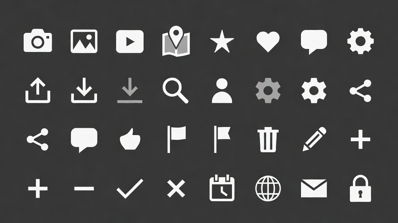 app icons, calendar icon, camera icon, chat bubble, check icon, dark background, download icon, envelope icon, flag icon, globe icon, heart icon, line icons, lock icon, map pin, pencil icon, photo icon, plus icon, search icon, settings gear, share icon, social media icons, star icon, thumbs up, trash icon, ui icons, upload icon, user icon, video icon, white icons, icons