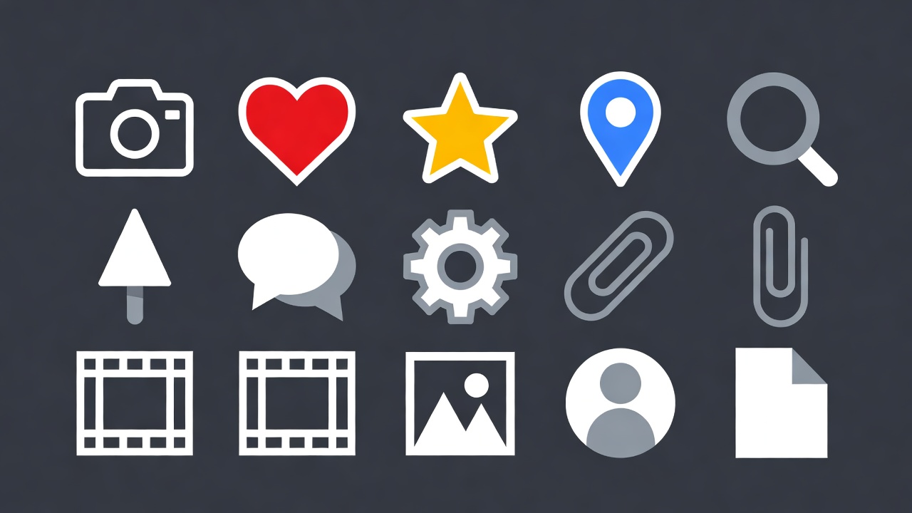 app icons, arrow up, blue pin, camera icon, chat bubble, clapperboard, dark background, document icon, flat design, gear icon, gray icons, heart icon, image frame, location pin, paperclip, photo icon, red heart, search icon, social media icons, star icon, ui icons, user profile, vector icons, video icon, white icons, yellow star, icons