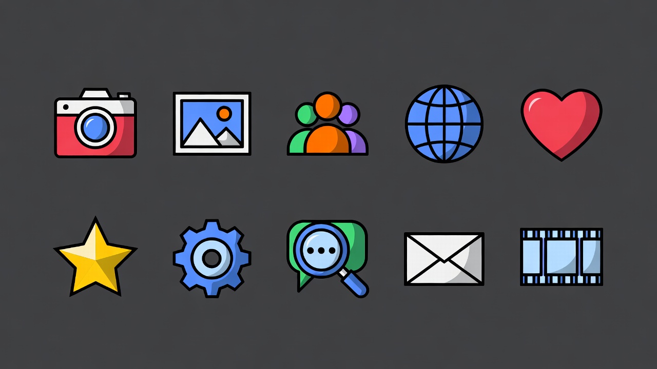 camera icon, chat bubble, clipart, colorful icons, digital icons, envelope icon, film strip, flat design, gear icon, globe icon, heart icon, illustration, isolated background, people group, photo frame, social media icons, star icon, ui icons, vector icons, icons