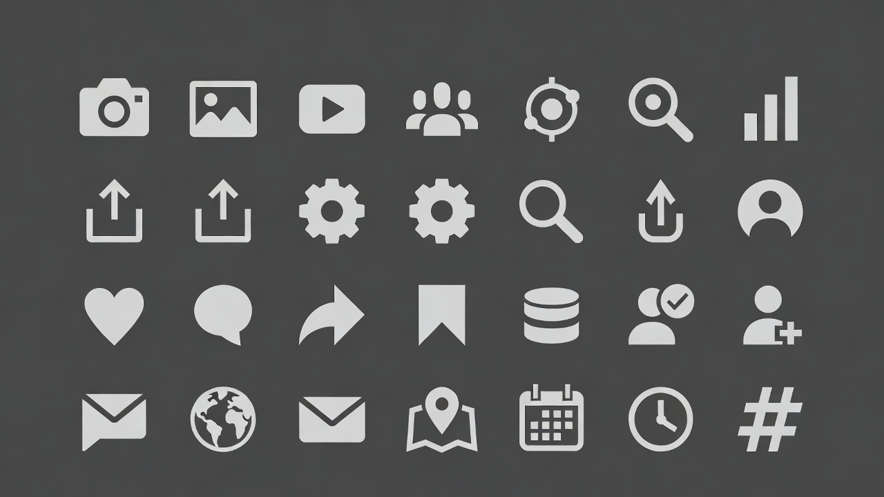 arrow icon, bookmark icon, calendar icon, camera icon, chat icon, check icon, clock icon, dark background, database icon, envelope icon, gear icon, globe icon, gray icons, group icon, hashtag icon, heart icon, map icon, photo icon, profile icon, search icon, settings icon, silhouette icons, ui icons, upload icon, user icon, video icon, web icons, social media icons