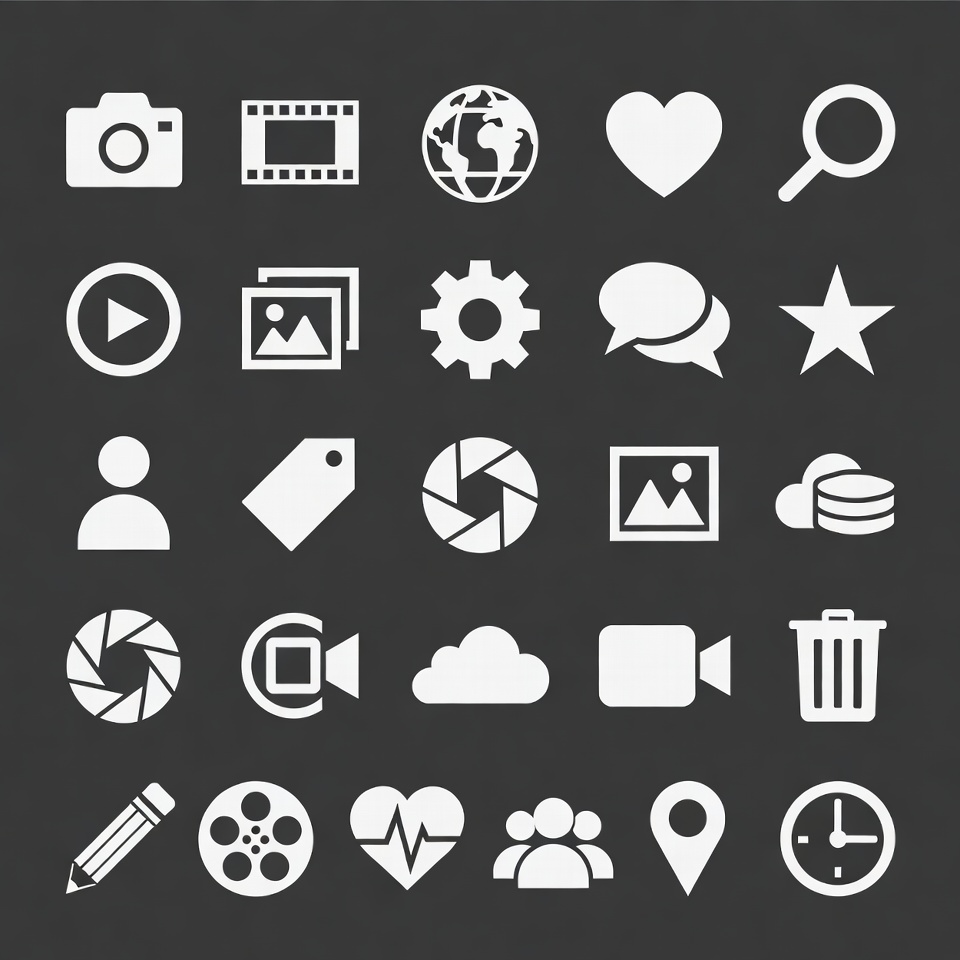 camera icon, clipart, clock icon, cloud icon, dark background, film reel, gear icon, globe, group people, heart icon, heartbeat, illustration, isolated background, location pin, media icons, pencil icon, person silhouette, photo frame, play button, price tag, search icon, shutter icon, speech bubble, star icon, trash can, video camera, white icons, icons