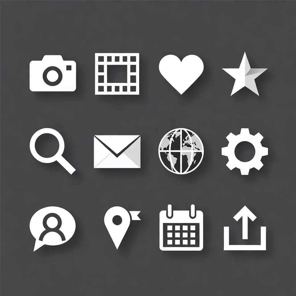 calendar icon, camera icon, envelope icon, film strip, flat design, gear icon, globe icon, gray background, heart icon, icon set, isolated background, location pin, magnifying glass, simple icons, star icon, upload arrow, user profile, vector icons, white icons, paper icons