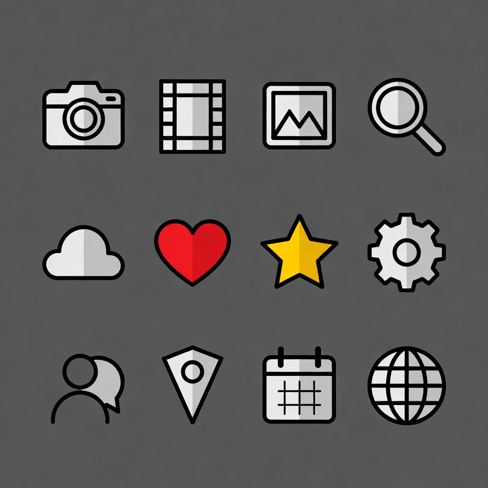 calendar icon, camera icon, chat bubble, clapperboard, clipart, cloud icon, colorful icons, flat icons, gear icon, globe icon, heart icon, illustration, image frame, isolated background, location pin, magnifying glass, media icons, star icon, ui icons, vector icons, icons