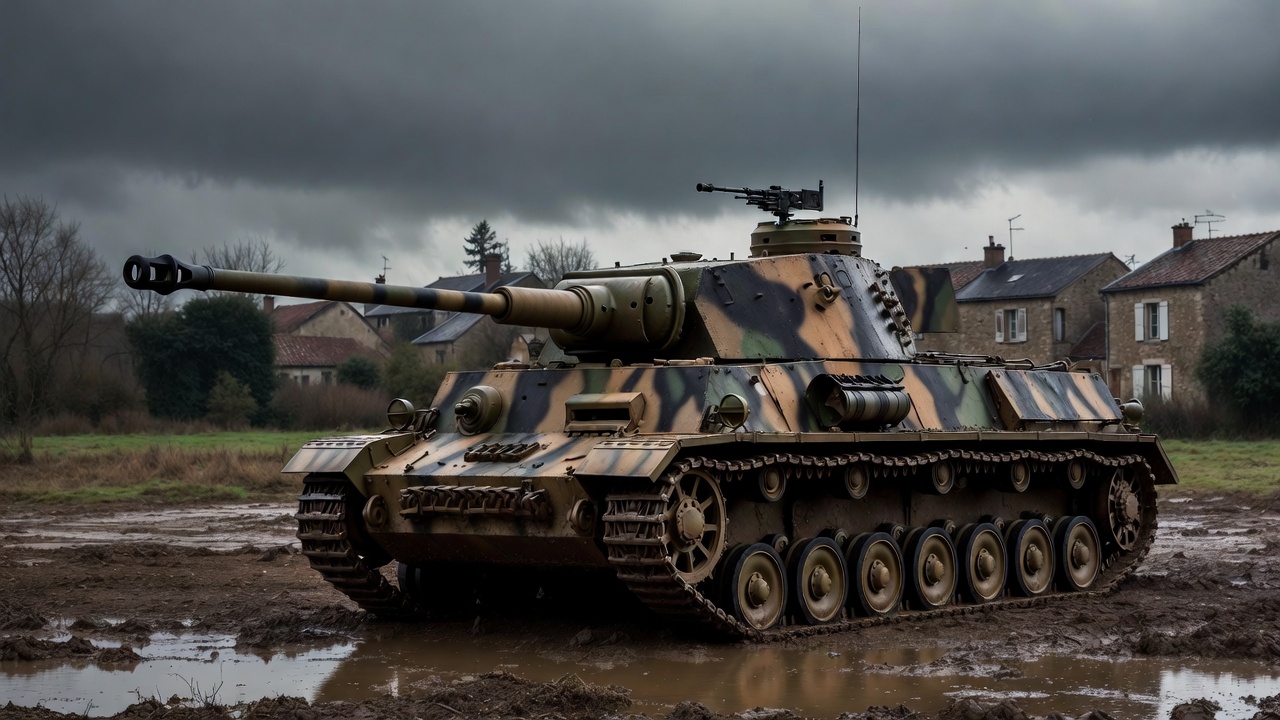 A German Panzer IV tank with camouflage paint stands in a muddy field under a cloudy sky. The tank features a long barrel gun, tracks, and machine gun, positioned near old brick houses and barren trees. Puddles of water reflect the overcast weather around the vehicle.