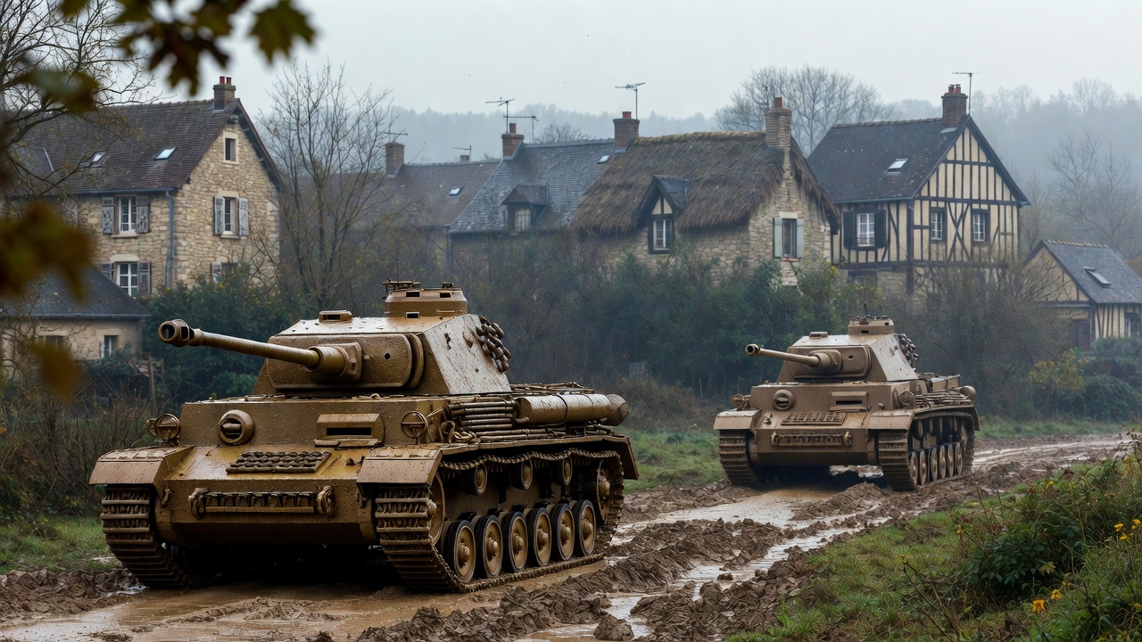 European village, German tank, WWII tank, World War II, armored vehicle, autumn landscape, battlefield reenactment, bushes, dirt path, foggy weather, military vehicle, mud splatter, muddy road, overcast sky, rural village, stone cottages, tank convoy, tank tracks, thatched houses, trees, Panzer tank