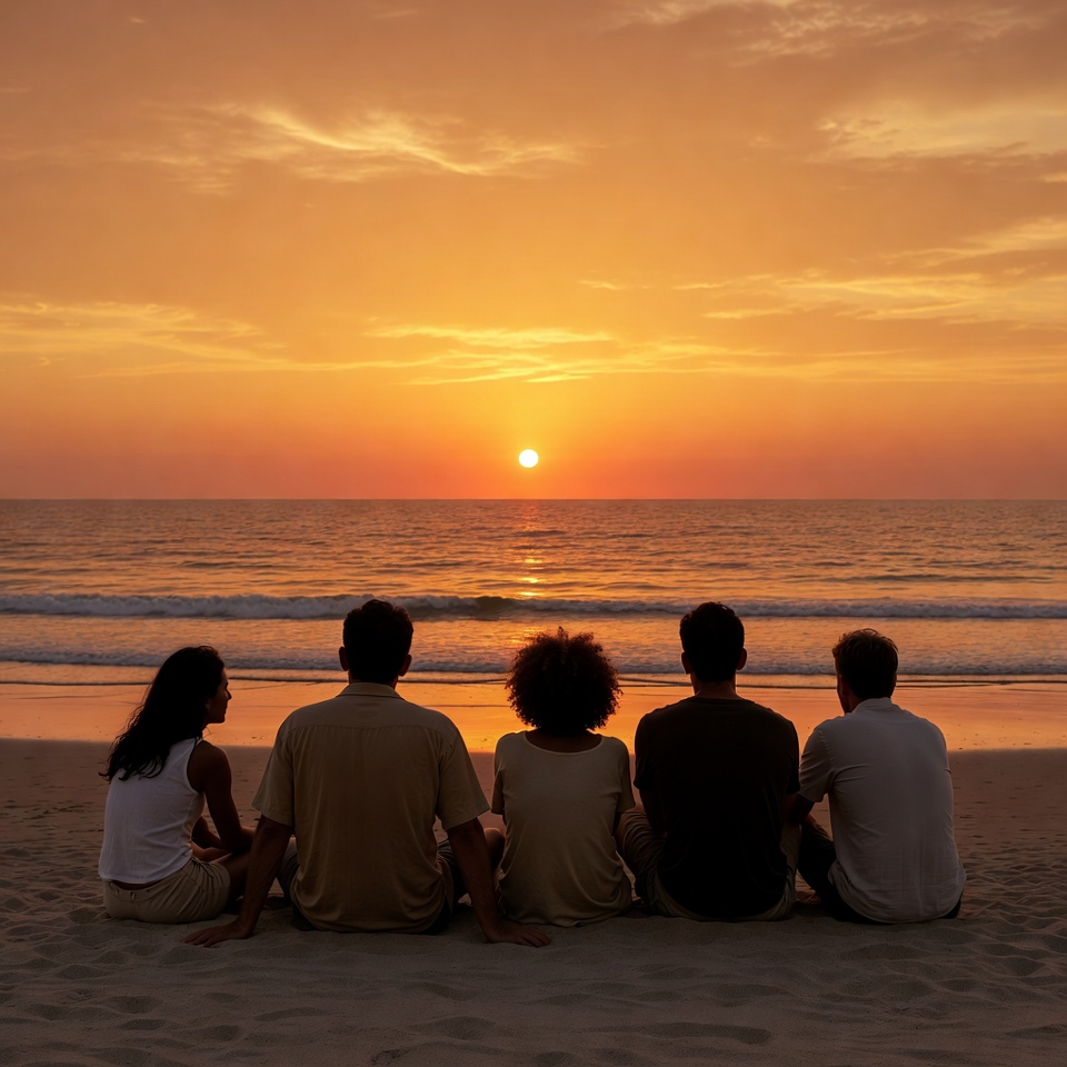 Five people with diverse ethnicities sit side by side on a sandy beach, facing the ocean and watching a vibrant orange sunset. They wear casual summer clothes like white dresses and light shirts. Gentle waves lap at the shore under a cloudy sky.